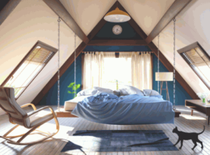 Geometric patterned curtains or Roman blinds and Venetian blinds can significantly contribute to the aesthetic appeal of the room, introducing texture and depth that harmonizes with the overall color scheme. The right combination of paint and textile choices creates a tailored and inviting atmosphere in the loft.