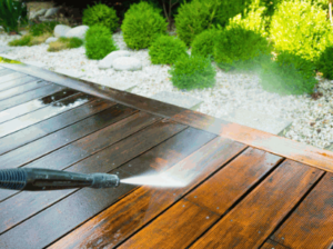 Thorough rinsing after deck pressure washing ensures the removal of residual cleaning products, dirt, and grime, leaving behind a clean and rejuvenated surface.